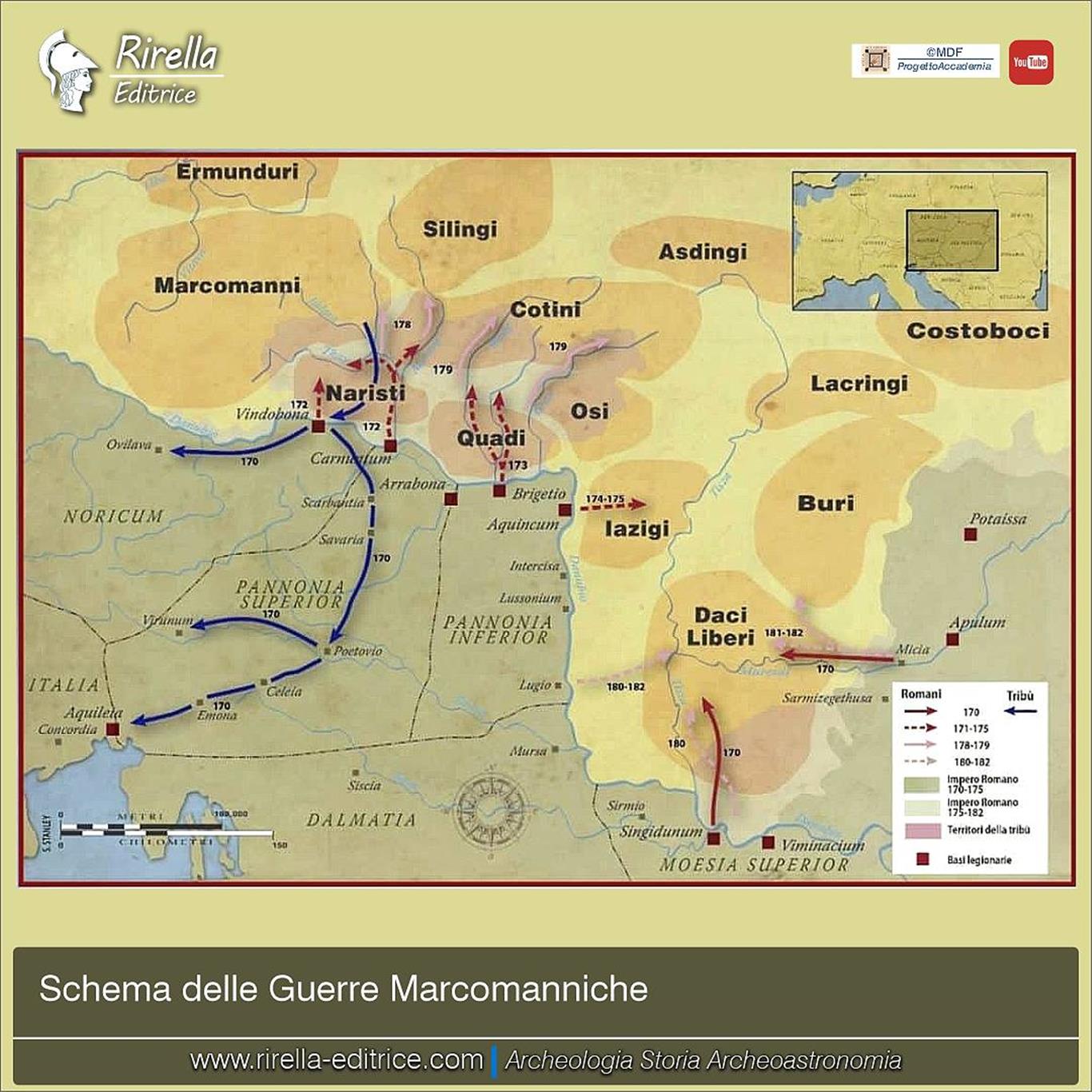 Un altro fronte si aprì anche nel nord dell’impero: nel 166 d.C. il Danubio venne superato da potenti e bellicose tribù germaniche che intendevano stabilirsi entro i confini romani perché a loro volta erano pressate da altri popoli nomadi. Nel 169 d.C. Lucio Vero morì improvvisamente ad Altino. Nel 170 d.C. i Quadi e i Marcomanni inflissero dure sconfitte ai Romani, distrussero Oderzo e arrivarono a assediare Aquileia. Ci vollero anni per riprendere il controllo di quei territori; la vittoria decisiva sui Marcomanni avvenne nel 178 d.C. durante l’ultima campagna militare di Marco Aurelio, che morì a Sirmio o a Vindobona il 17 marzo del 180.
