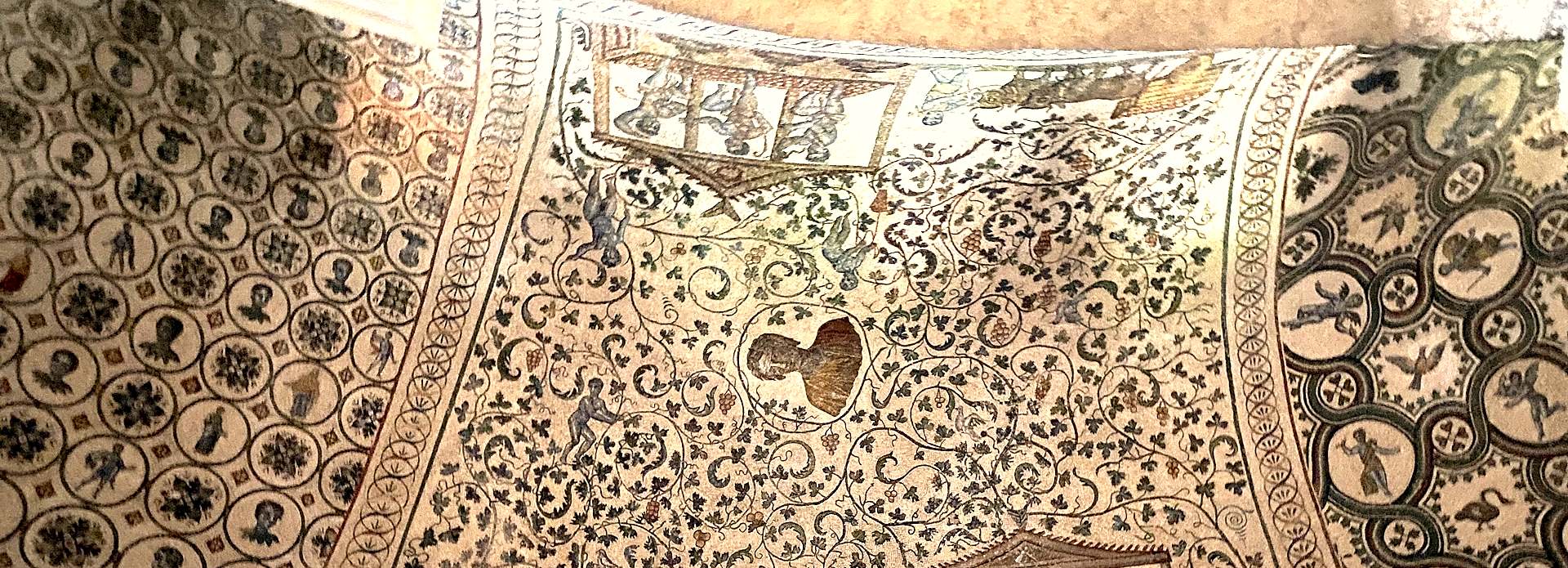 Given that in some mosaics there are vine swirls and scenes of grape harvest, for a long time it was thought that in pagan times the building had been a temple dedicated to Bacchus or Dionysus. Actually, the harvest scenes allude to the evangelical similarities of the vineyard and the vine, and in practice a new meaning was given to a very ancient iconography.