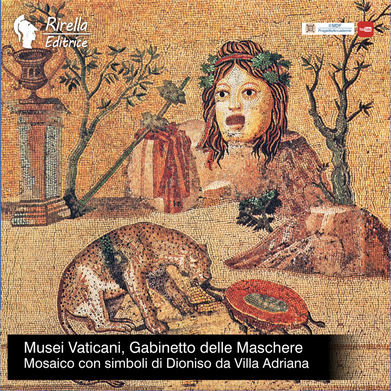 Nel terzo mosaico si vede una Maschera coronata da foglie di vite e sotto vi sono i simboli di Dioniso: un Leopardo che addenta uno strumento musicale, e poi un kantharos sopra a un pilastrino.