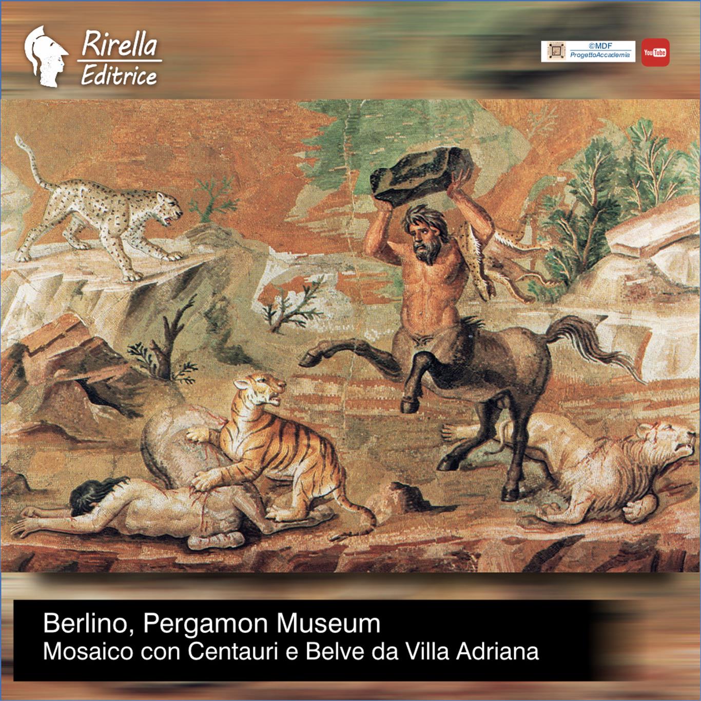 Il mosaico con la lotta fra Centauri e Belve fu rinvenuto nel Triclinio dei Centauri (PI46) assieme ad altri pannelli, e raffigura una Centauressa caduta a terra e ferita dagli artigli di una tigre. Al centro del quadro è un Centauro che sta per scagliare un grosso masso di pietra sulla Tigre, e dietro di lui si vede un Leone ormai morto; in alto a sinistra un Leopardo osserva la scena dall’alto di una roccia.