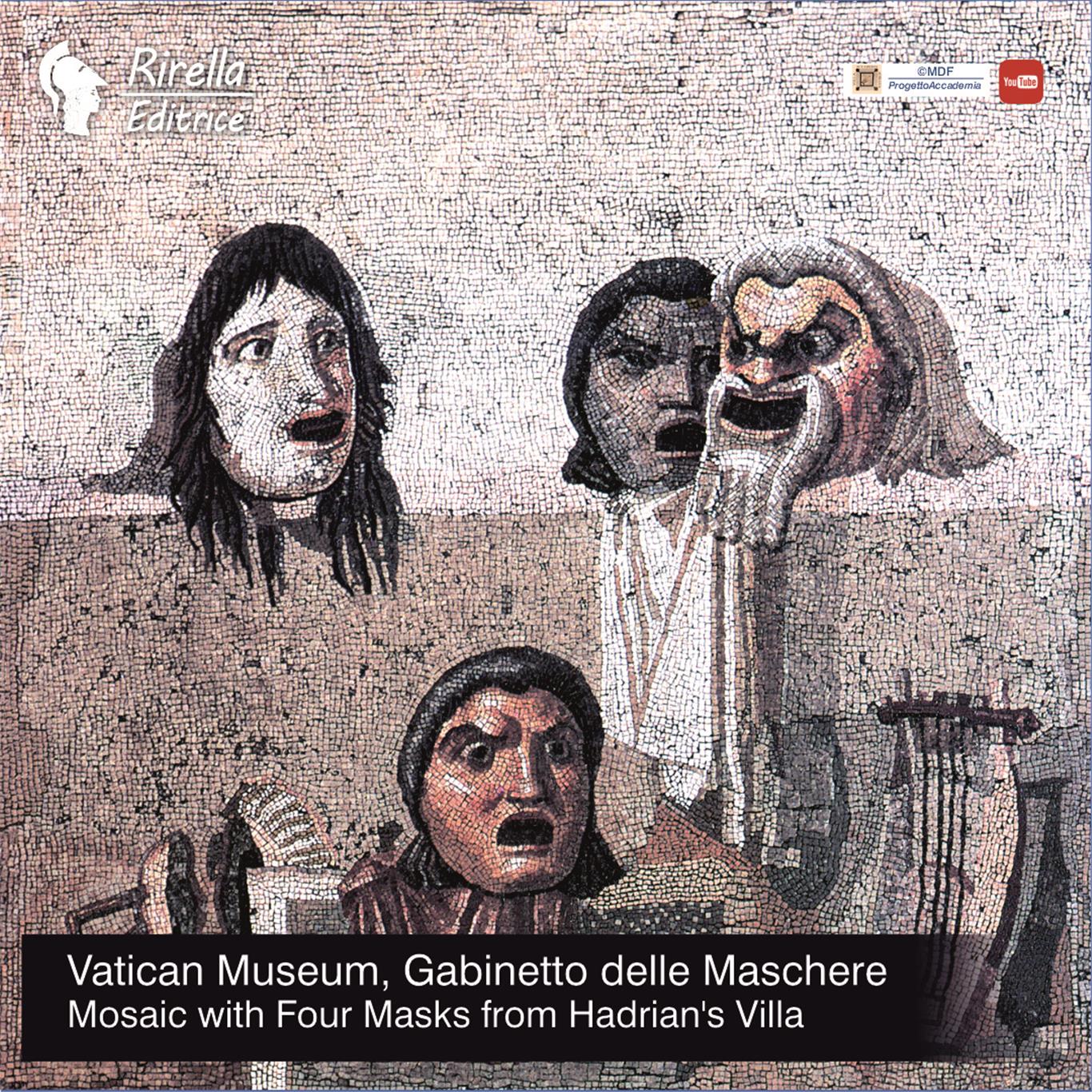 The first mosaic depicts four scenic Masks and Apollo's Lyre and was originally at the centre of a quadrangular room (PI47) near the Triclinium of the Centaurs, and had the aforementioned frame along the walls.