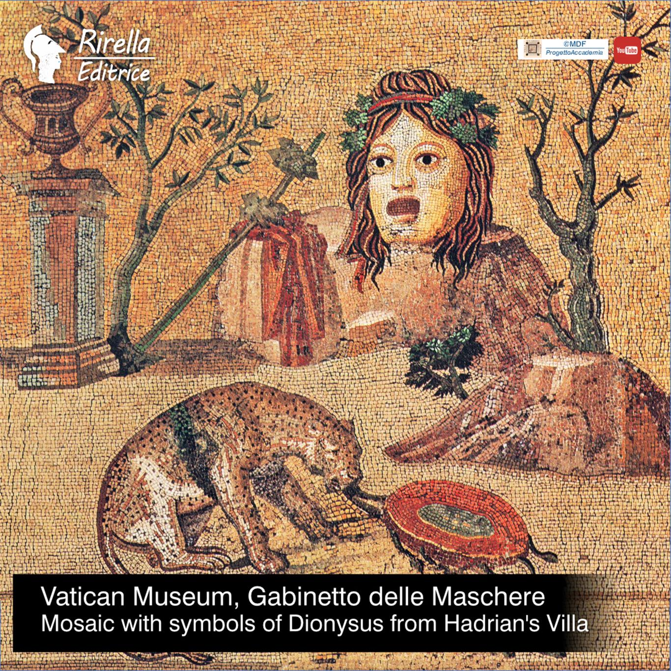 The iconography of the panels with Masks, wild beasts and vine leves is linked to the myth of Dionysus, who was frequently depicted in the decorations of the Triclinia, because the god was linked to wine and banquets.