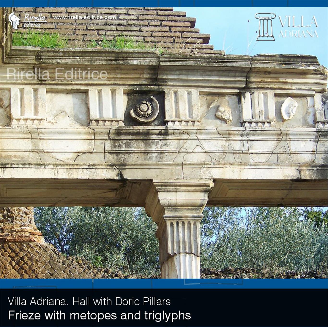 A fragment of a Doric frieze can be seen on the façade of the same building. It too comes from Villa Adriana, from the Hall with Doric Pillars, where there still is a much better preserved section with triglyphs and metopes.