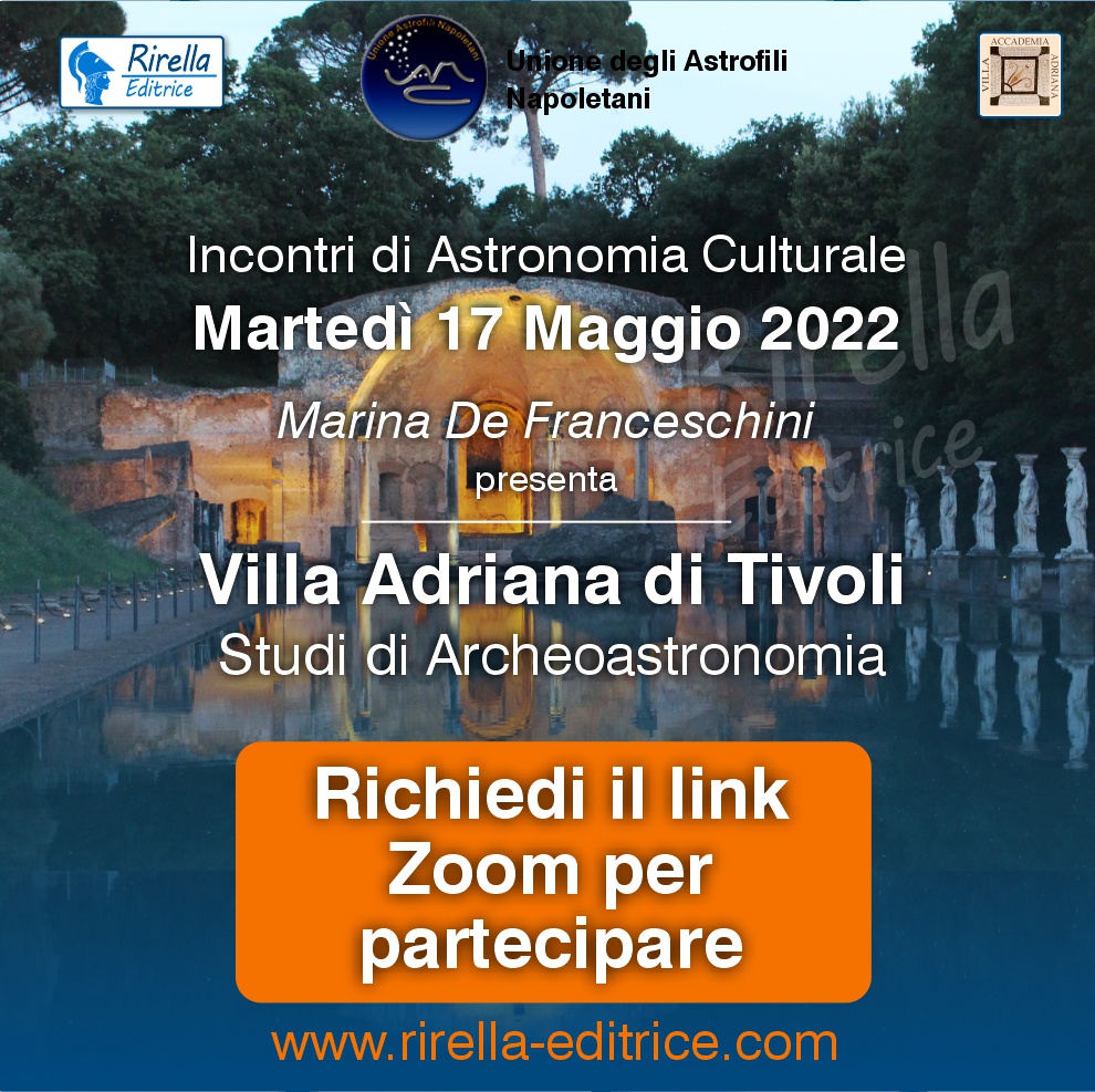 ✅ Tuesday, May 17th 32022, at 9pm Marina De Franceschini will give an on-line presentation about Archaeoastronomy in Hadrian's Villa near Tivoli, Rome, during he Meetings of Cultural Astronomy, organized by the Unione Astrofili Napoletani.
