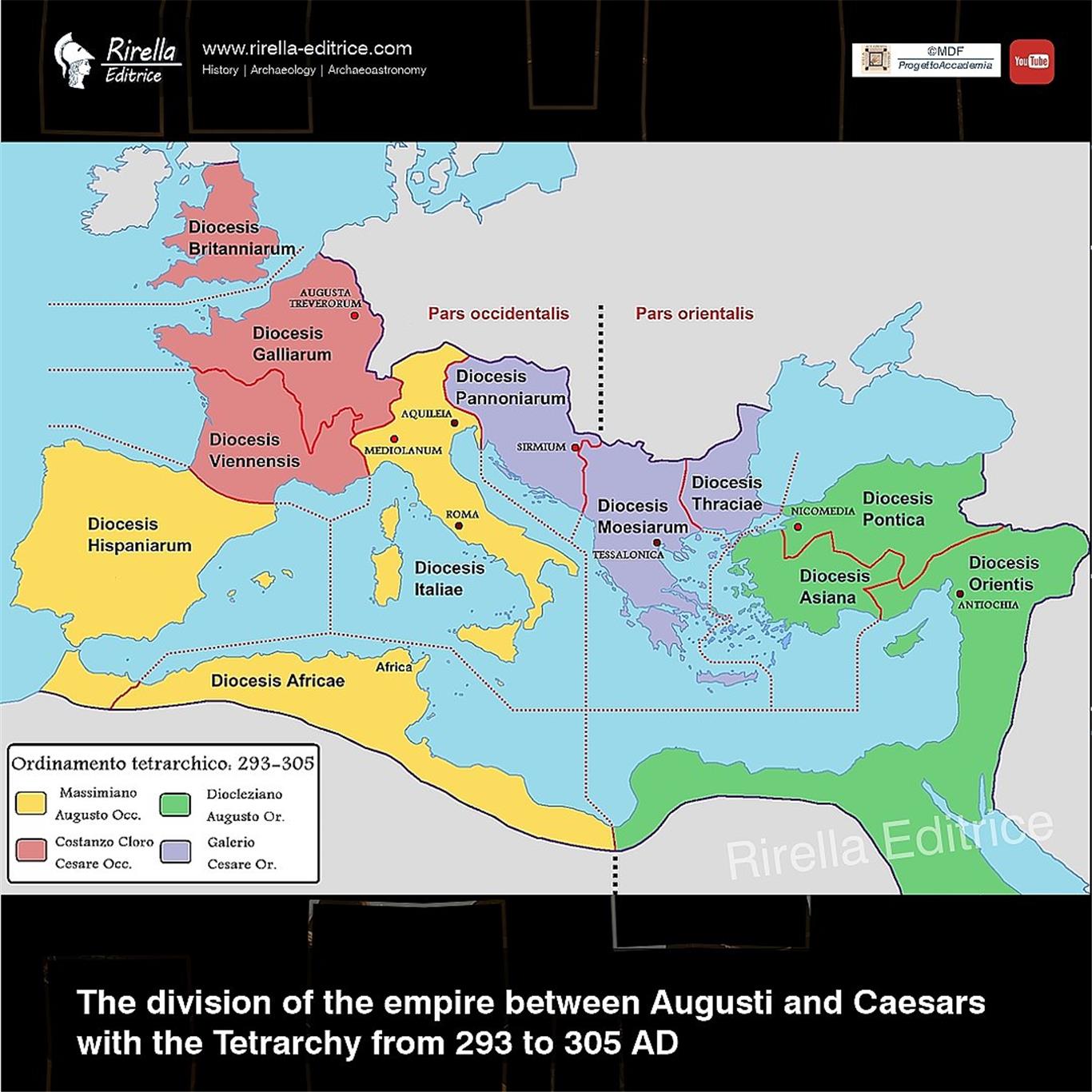 To deal with it, in 286 AD. Diocletian decided to share the command of the empire with Maximian, one of his best generals: he appointed him Augustus minor for the Western Empire while maintaining for himself the title of Augustus major for the Eastern Empire.