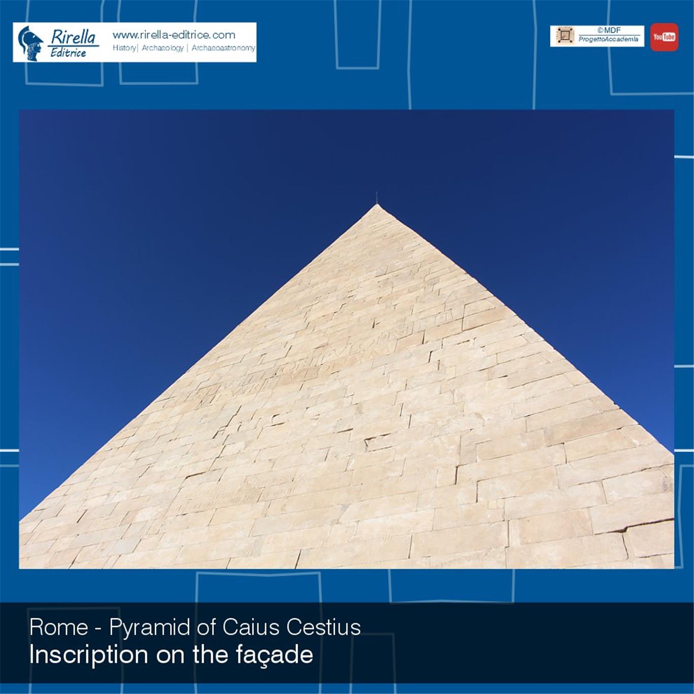 The Pyramid of Cestius was built along the Via Ostiense in the first century B.C. (between 18 and 12 BC) in little less than one year, because if the heirs had not completed it within 330 days they would have lost the rich inheritance, as explained by another inscription on the façade.